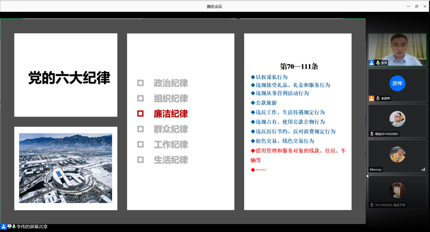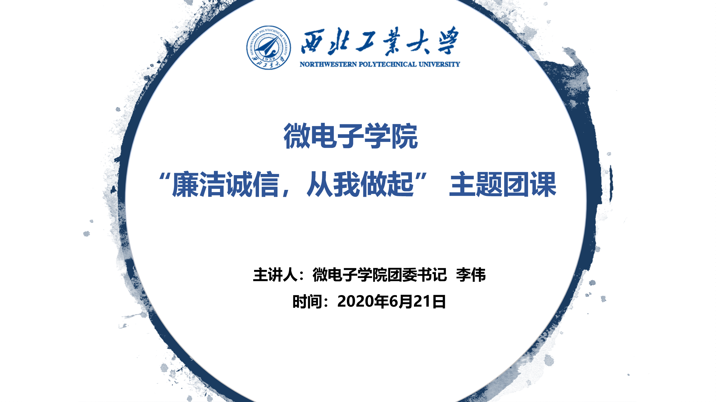 为进一步加强大学生思想政治教育,让同学们正确理解和认识到反腐倡廉对自身和国家的重要意义,微电子学院团委于2020年6月21日为电子信息类12-15班的所有团员在线开展了 “廉洁诚信,从我做起”主题教育团课,向同学们讲解团学青年和学生骨干在日常学习和生活中所应遵守的廉洁品质。
