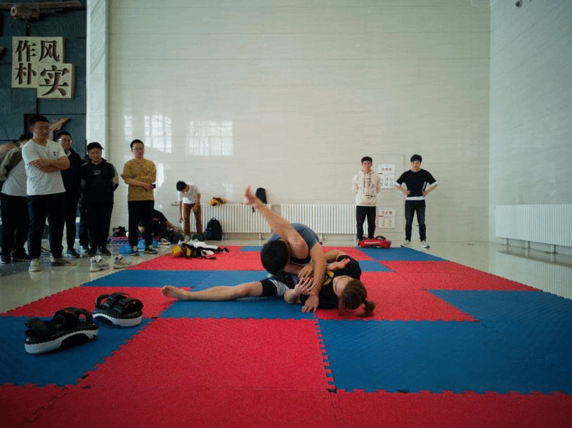 首先是社团负责人宣传综合格斗的知识并展示了MMA的基本技术动作,同学们都目不斜视、兴致勃勃地观察学习动作,华丽的动作赢得了参赛队员的阵阵喝彩。