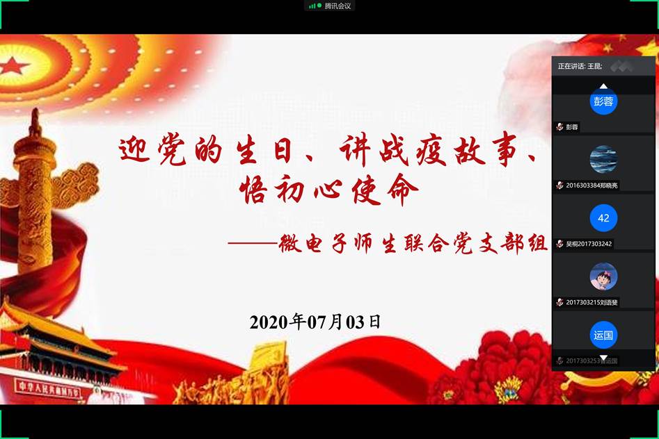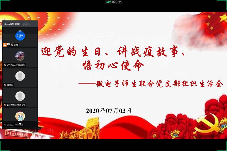 为庆祝建党99周年,7月3日晚,微电子学院微电子师生联合党支部利用腾讯会议平台,在线开展了“迎党的生日、讲战疫故事、悟初心使命”的专题组织生活会。学院党委副书记彭蓉、副院长王少熙,以及学院全体教工党员和学生党员参加了本次组织生活会,会议由党支部书记刘炜主持。会上,每位教工党员和学生党员代表一起分享了疫情期间的亲身经历、身边的抗疫故事和自己的切身体会。