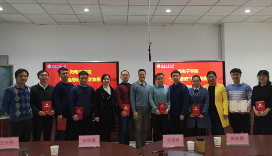 为全面推进习近平新时代中国特色社会主义思想和党的十九大精神进教材、进课堂、进头脑,充分发挥专业课程的育人功能,将思想政治工作贯穿教育教学全过程,12月18日,微电子学院举办了教师“课程思政”教学竞赛。教务处姚如贵副处长、马克思主义学院赵海霞副教授、微电子学院党委副书记甘雪涛(主持工作)、副院长王少熙、副书记彭蓉出席竞赛并担任评委。