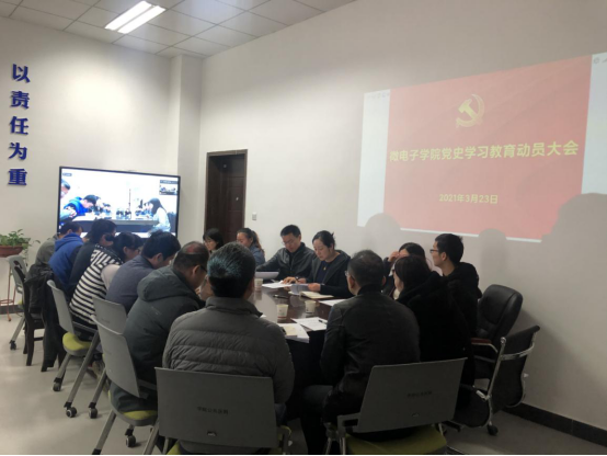 3月23日,微电子学院在长安校区学院楼138办公室召开党史学习教育动员大会。学院全体教职工党员以及学生党员代表参加会议,太仓校区教职工党员线上参加。会议由学院党委副书记(主持工作)甘雪涛主持。