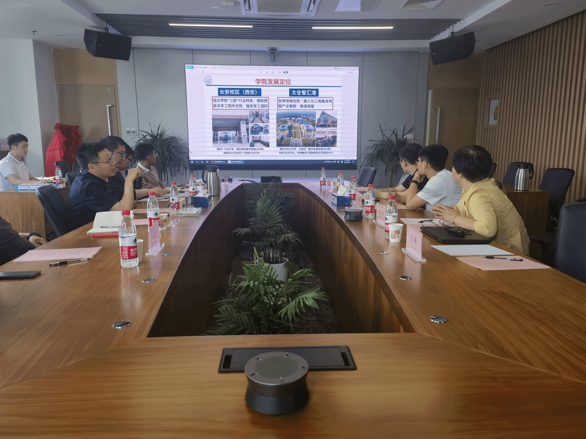 参观结束,双方在太仓智汇港702会议室进行座谈交流,相互介绍各自基本情况和科研发展规划需求,围绕发挥学院科技优势,为国家‘芯运动”的发展战略添砖加瓦。