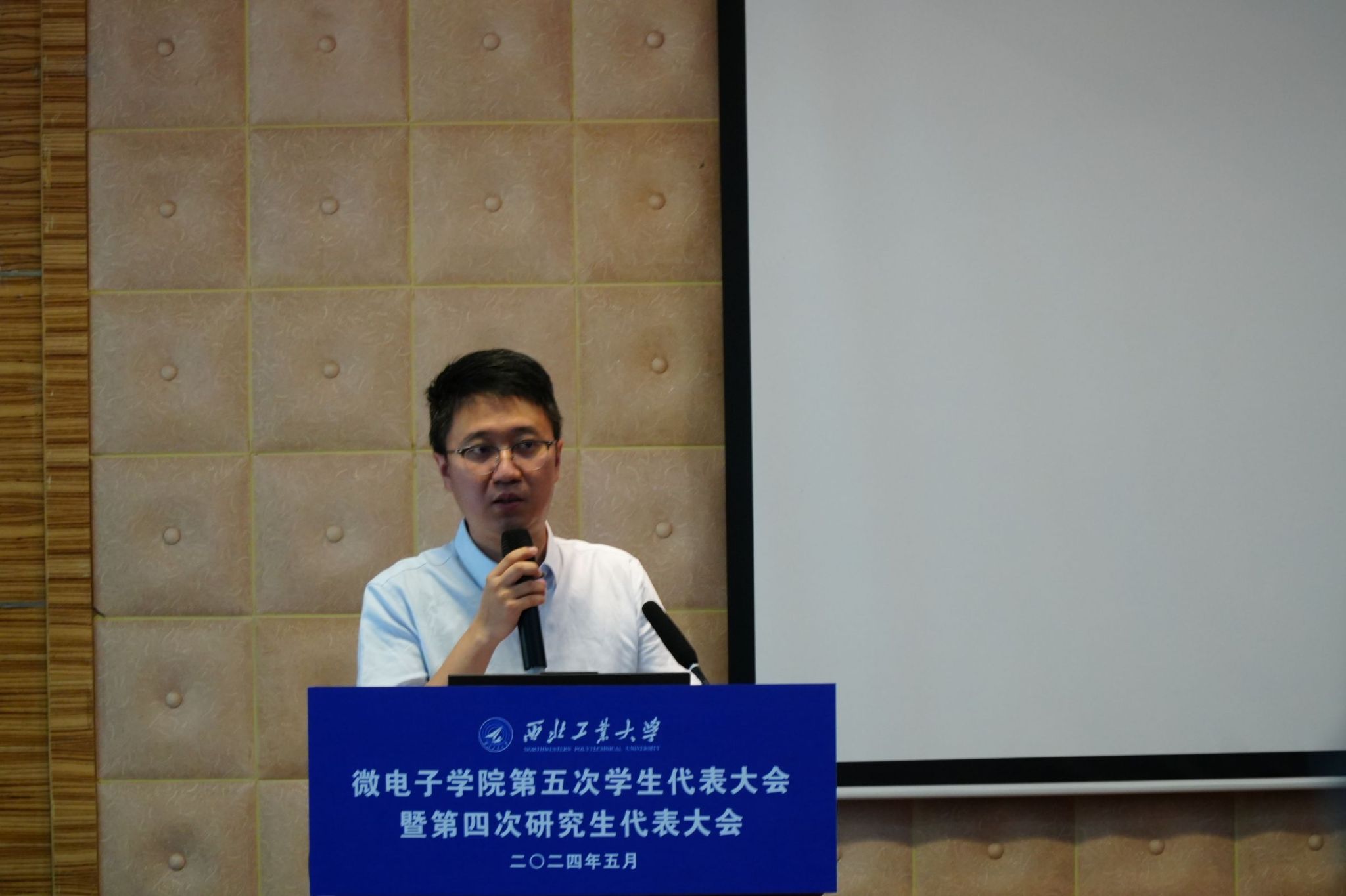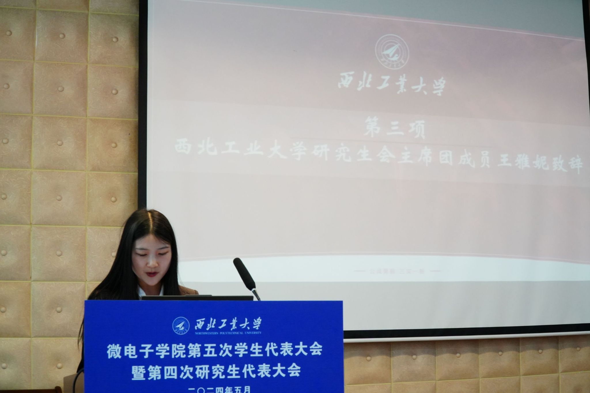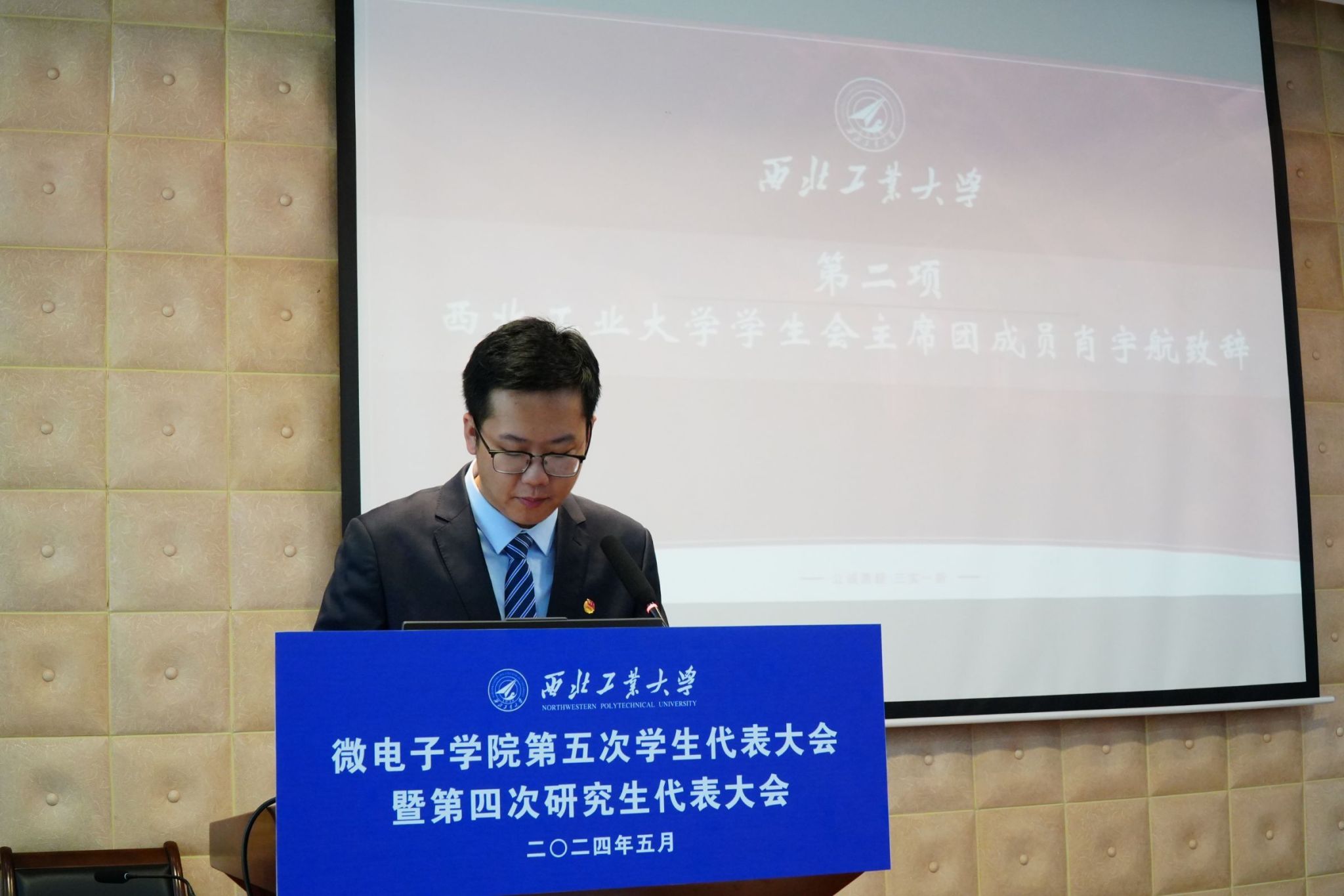 微电子学院第五次学生代表大会暨第四次研究生代表大会正式拉开序幕。校学生会主席团成员肖宇航致辞,肖宇航分享了自己在校学生会的工作经验,希望同学们能够筑牢青春根基、书写人生华章,强调学生会应全心全意服务同学,并衷心祝愿本次会议顺利召开。随后,校研究生会主席团成员王雅妮发言。王雅妮提到三个“聚焦”——聚焦政治引领、聚焦形神兼备、聚焦主责主业,呼吁同学们团结在党的周围,发扬总师育人文化。