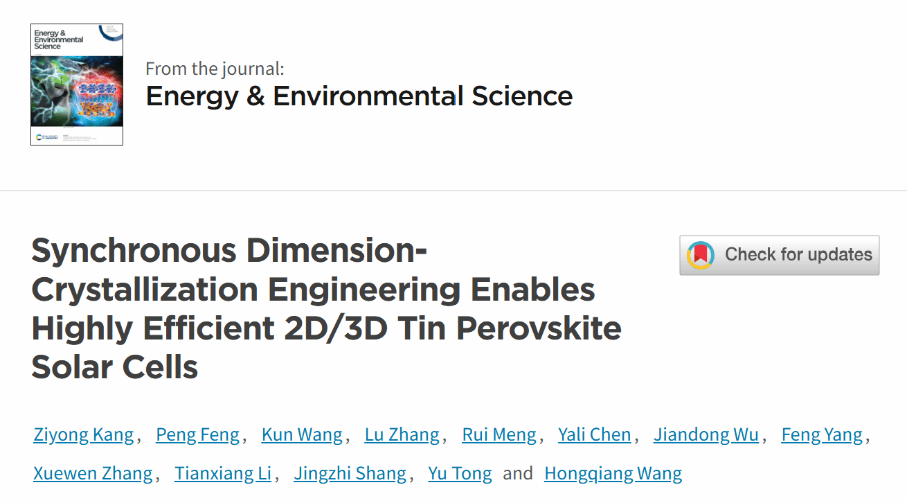 引用本文:Ziyong Kang, Peng Feng, Kun Wang*, Lu Zhang, Rui Meng, Yali Chen, Jiandong Wu, Feng Yang, Xuewen Zhang, Tianxiang Li, Jingzhi Shang, Yu Tong* and Hongqiang Wang*, Synchronous Dimension-Crystallization Engineering Enables Highly Efficient 2D/3D Tin Perovskite Solar Cells.