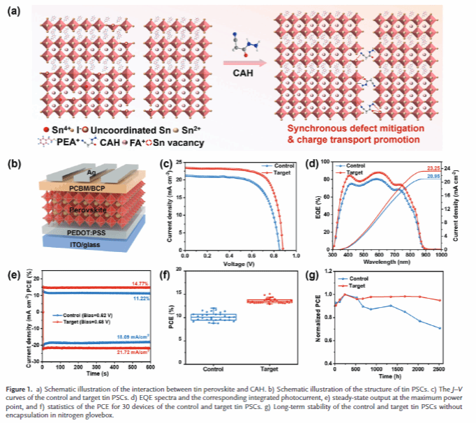 基于此,我院副教授王昆与材料学院佟宇教授、王洪强教授等人合作,利用多功能路易斯碱氰基乙酰肼(CAH)与钙钛矿之间的多重相互作用,协同调控2D/3D锡钙钛矿的结晶和相分布,降低薄膜的缺陷态密度、显著改善载流子传输,从而实现了15.06%的效率,同时器件的运行稳定性和放置稳定性也得到显著提高。该工作近期发表在国际顶级期刊《Advanced Energy Materials》(影响因子:24.4)上。