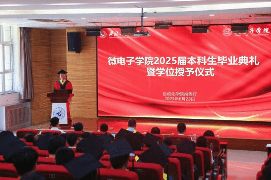 微电子学院2025届本科生毕业典礼暨学位授予仪式在自动化学院报告厅举行,共同见证毕业学子们学业圆满、扬帆起航的重要时刻。学院院长马炳和、党委书记杨妮花、校友代表杜慧敏、副院长王少熙、党委副书记余鹏、教师代表、毕业生家长代表及全体毕业生参加典礼。典礼由副院长阴玥主持。