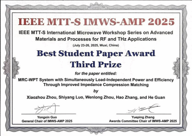 周小舟获奖论文《MRC-WPT System with Simultaneously Load-Independent Power and Efficiency Through Improved Impedance Compression Matching》,聚焦无线传能中收发线圈位置不固定导致的Class E逆变器负载不稳、功率效率下降等关键问题,研究融合静态阻抗压缩与动态电压反馈控制,提出了恒功率高效阻抗区域相应系统设计方法,研制的6.78MHz Class E² 40W氮化镓高频磁谐振无线传能系统,在线圈2.5cm 轴向位移、15°角度偏移或5.3cm 横向错位时,仍能稳定输出40W直流功率,系统端到端效率超过85%。